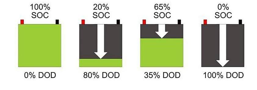 Es el porcentaje de energía que se puede descargar la batería en relación con la capacidad total de carga de la misma. Para entender este aspecto te pondremos el siguiente ejemplo: tenemos una batería de 250 Ah, y la recomendación del fabricante es una profundidad de descarga máxima del 80%. Esto quiere decir que no deberías dejar que tu batería quede por debajo del estado de carga (SOC) del 20% o en este caso de 50 Ah, pues de esa manera la batería empezaría a perder su vida útil.