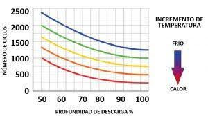 A continuación te mostramos un gráfico en el que se puede evidenciar que, cuando la temperatura aumenta, el número de ciclos de la batería disminuye. Así mismo, en la medida que la profundidad de descarga se acerca al 100% se genera una mayor exigencia a la batería y los ciclos de vida útil que esta puede cubrir, también disminuyen.